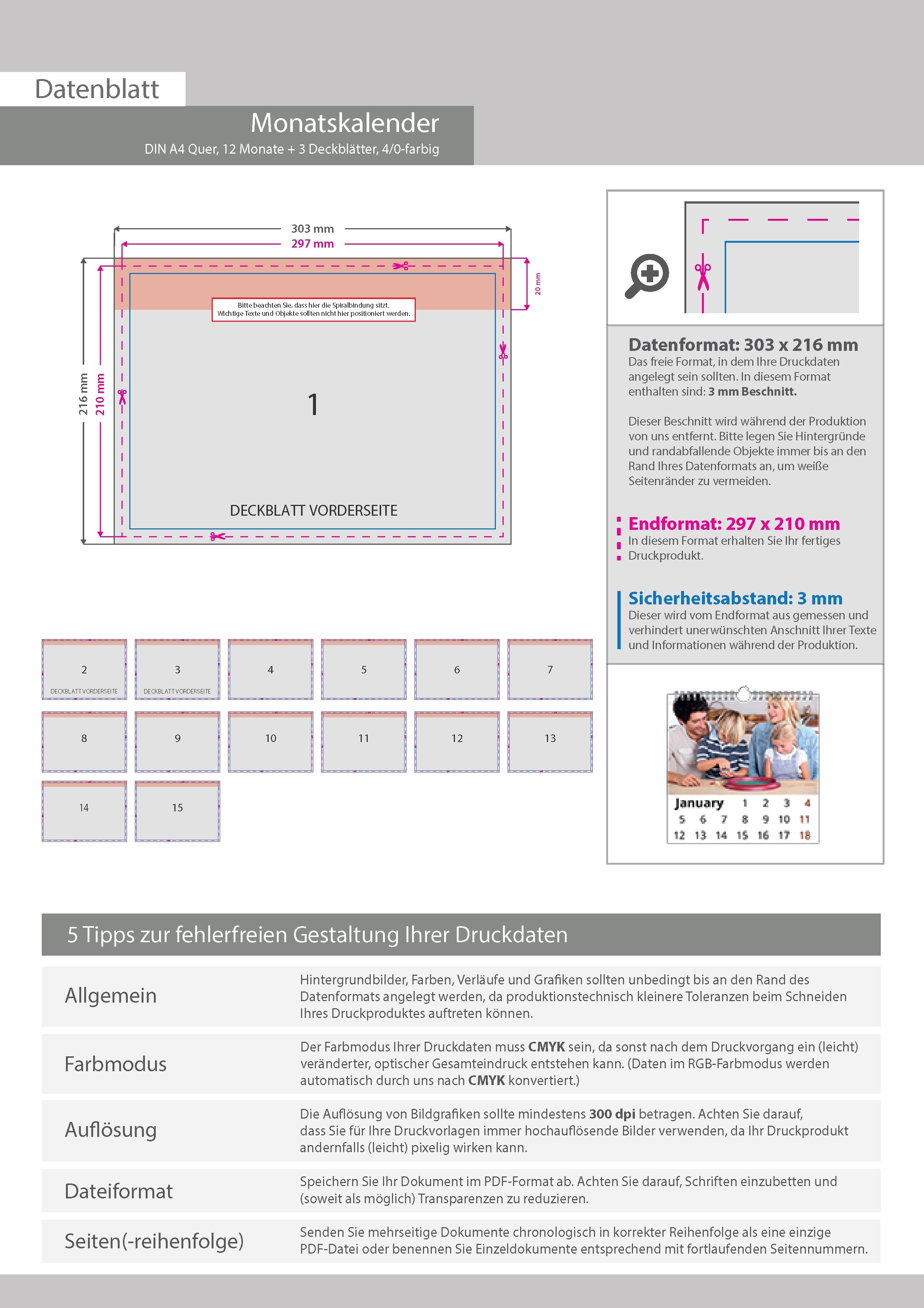 Monatskalender 15 Blatt (12 Monate + 3 Deckblätter)